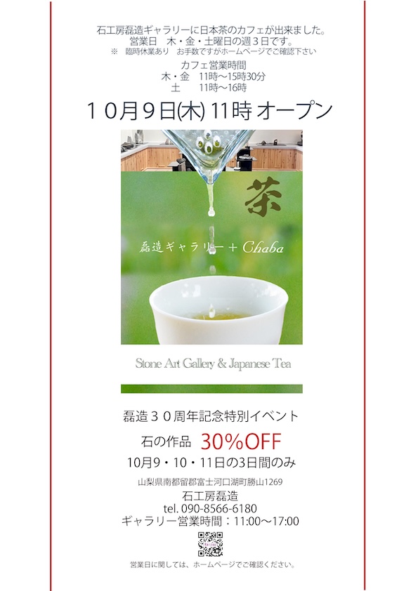 2025.10/9 | ギャラリー大改装により、「磊造ギャラリー + Chaba」オープン。 日本茶のカフェです。担当の女性によって運営。木金土の3日間/週の営業です。 |